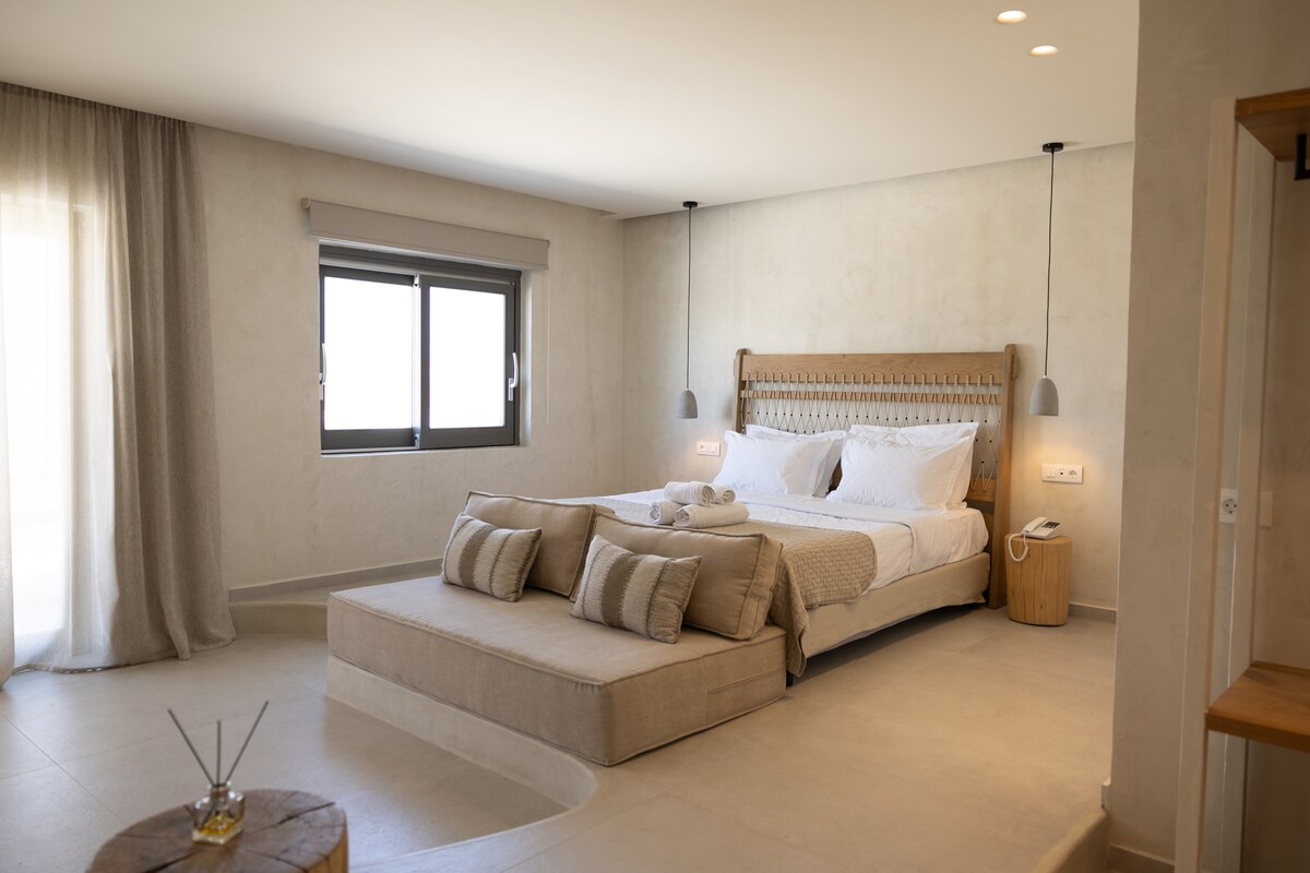Olive Mykonos Villas - is a new hotel located in Ano Mera , Mykonos, in close proximity from of Elia and Agrari beach. The Standard Room features a king size bed made from a famous Italian designer and a couch which becomes a singe bed , a bathroom made from screed with shower cabin and stone washbasin. This room is 30 square meters and is suitable mostly for short stays.The veranda provides a peaceful spot for every day breakfast and relaxing moments. Can accommodate up to 3 people.