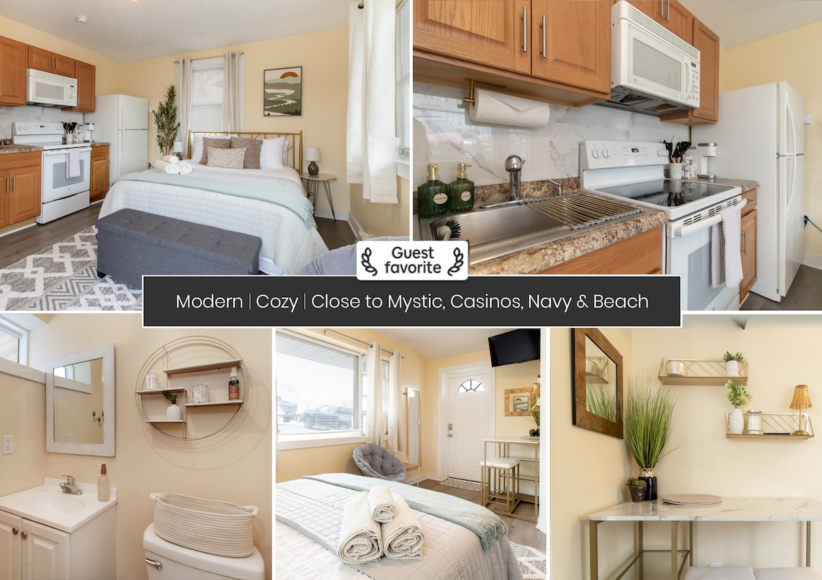 Ciesz się wszystkimi udogodnieniami i udogodnieniami domu w samym sercu Downtown Mystic, obecnie jednym z najpopularniejszych miejsc w Nowej Anglii. To nowe, nowoczesne i przytulne studio na poziomie ogrodu znajduje się przy Water Street, naprzeciwko rzeki Mystic. Odkryj najpopularniejsze miejsca, sklepy i restauracje Downtown Mystic bez konieczności posiadania samochodu (ale bezpłatne miejsce parkingowe poza ulicą jest wliczone w cenę)! Wszystko jest tylko kilka kroków stąd.