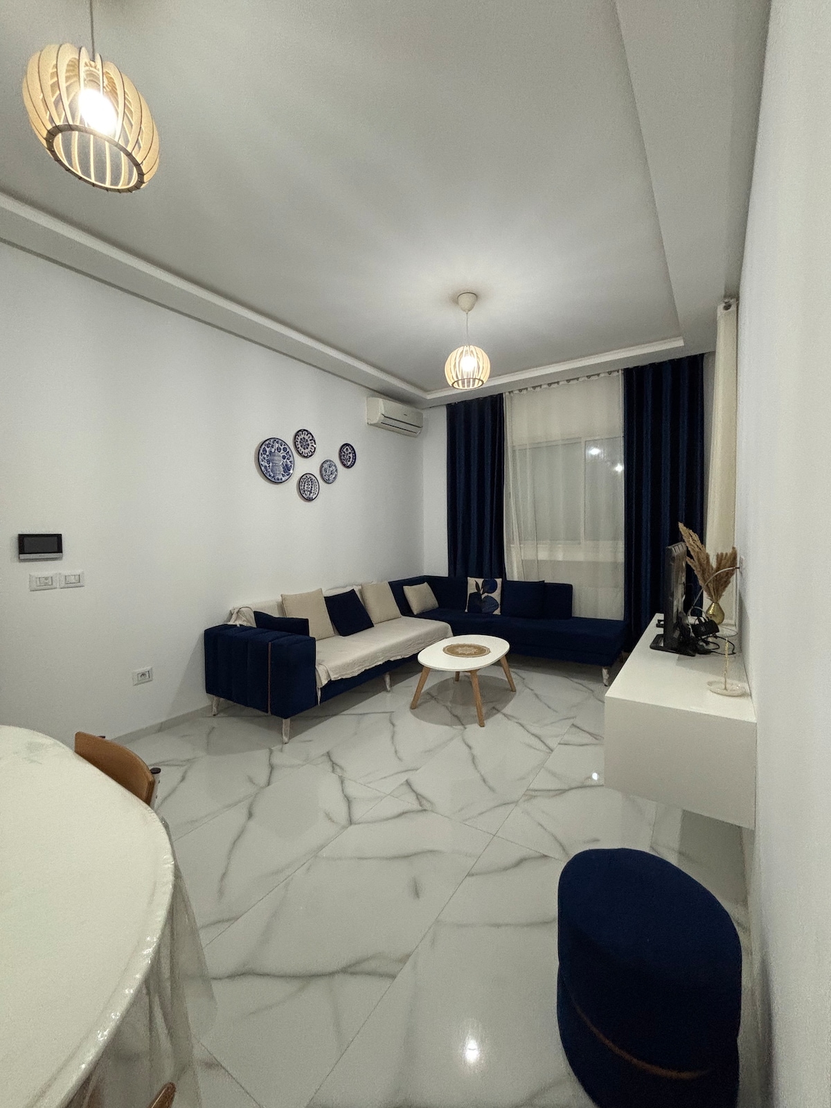 Umeblowany apartament S+2 o wysokim standardzie w nowym prestiżowym, strzeżonym i bezpiecznym miejscu z 2 windami i 2 basenami, cieszący się uprzywilejowaną lokalizacją w pobliżu morza i w pobliżu wszystkich udogodnień. w apartamencie znajduje się centralne ogrzewanie i 3 klimatyzatory. salon ma uroczy balkon, który otwiera się na aleję i morze. kuchnia jest wyposażona w płytę grzewczą,okap kuchenny,piekarnik, pralkę,lodówkę i mikrofalówkę.