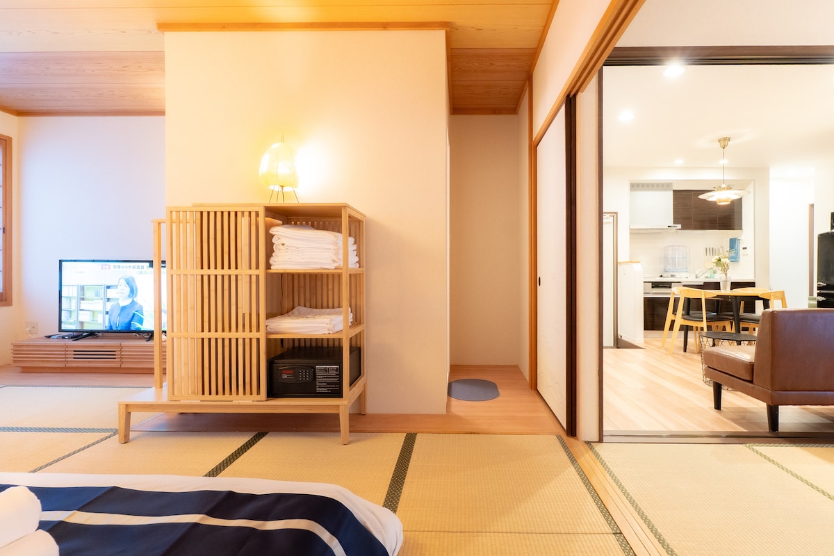 Dziękujemy, że zainteresowała Cię nasza oferta, i witamy w Kioto, starożytnej stolicy kultury! Mam nadzieję, że znajdziesz miejsce na pobyt z doskonałą obsługą i uważnym zarządcą! Nasza oferta to rzadko spotykane, ciche i przestronne mieszkanie zajmujące całe piętro z windą w Kawaramachi, w samym sercu Kioto. ❤️ Polecam to miejsce dla 4–10 osób; jest bardzo wygodne! Poniższe szczegóły dotyczące naszego pokoju zostaną uzupełnione do marca 2026 roku. Od teraz Twoje wrażenia będą jeszcze lepsze niż wcześniej! Starannie wybraliśmy charakterystyczne japońskie materiały, Główna ściana salonu, przy której znajduje się telewizor, pokryta jest wysokiej jakości tapetą z wzorem tkaniny, co nadaje jej designerskiego charakteru. Cała przestrzeń, położona w największym i znanym na całym świecie japońskim regionie produkcji tkanin wełnianych, emanuje ciepłą i przytulną, domową atmosferą. Do renowacji tej wyjątkowej łazienki wykorzystaliśmy płytki tkane we wzór w jodełkę, wykonane przy użyciu wyrafinowanej, wielowiekowej techniki produkcji płytek z prefektury Gifu. Płytki te tworzą dynamiczny, trójwymiarowy efekt, gdy gra na nich światło i cień. Ceramika Mino ma prawie 1300-letnią historię, a przemysł produkuje te niezwykle misternie wykonane płytki od ponad stu lat. Starannie odnowiliśmy również suszarkę do włosów Dyson, dodaliśmy wentylator bezłopatkowy Dyson, czajnik japońskiej marki designerskiej, zupełnie nowy klimatyzator Daikin z funkcją ogrzewania i chłodzenia w salonie oraz najlepszą słuchawkę prysznicową w Japonii! Podłoga pochodzi z Asahi Woodworks, stuletniej japońskiej firmy, i jest najwyższej jakości, a jej cena jest trzykrotnie wyższa niż w przypadku produktów wyprodukowanych w Chinach. Dużo uwagi poświęciliśmy również pościeli. Używamy materaca sprężynowego z ramą typu boxspring, dlatego goście wspominają w recenzjach, że łóżko jest bardzo wygodne.Mam nadzieję, że podczas pobytu w Japonii będziesz mieć okazję doświadczyć naszej troskliwej obsługi, dogodnej lokalizacji i doskonałego zakwaterowania. Dziękuję.