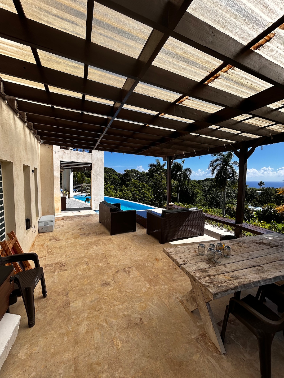 "Bienvenidos a nuestra impresionante Villa Dela. Esta lujosa residencia vacacional ofrece una experiencia inolvidable. Rodeada de exuberante vegetación tropical, nuestra Villa ofrece espacios interiores y exteriores elegantes. Disfruta de habitaciones espaciosas, cocina completamente equipada y baños de lujo. Relájate en la piscina infinita y contempla las impresionantes vistas desde la terraza. Cerca de playas, cascadas y senderos naturales. Reserva ahora y vive una experiencia caribeña única!