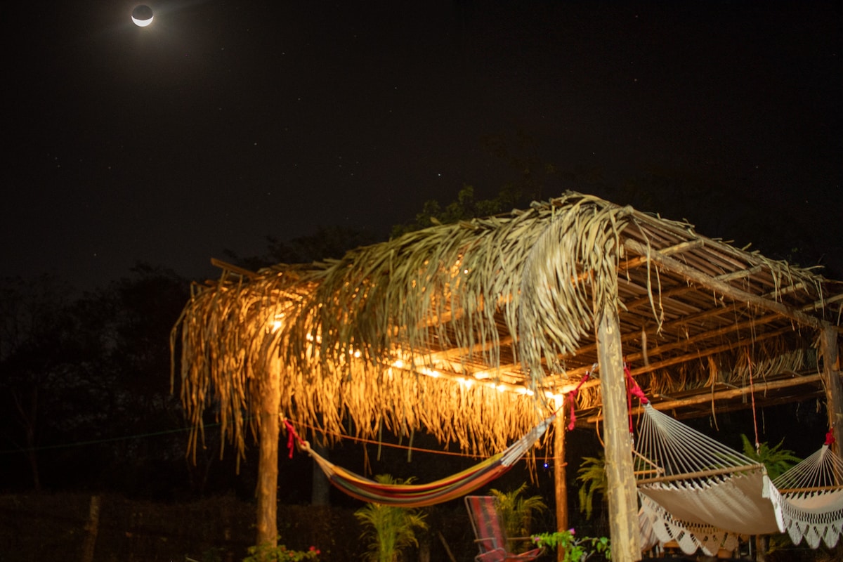 Przytulna chatka otoczona rodzimymi drzewami i ogrodem z heliconiami i innymi roślinami, które zapewniają świeżość i dobre wibracje. 30 minut od plaży Sámara, 200 metrów od rzeki, w której można się ochłodzić, 3 minuty od centrum Nicoya. Miejsce, które łączy spokój i komfort, nadaje się do pracy, odpoczynku lub jako punkt wypadowy do różnych plaż i innych ciekawych miejsc. Wyposażony w kuchnię i przybory kuchenne, pralkę, suszarkę, lodówkę i dwa podwójne łóżka.