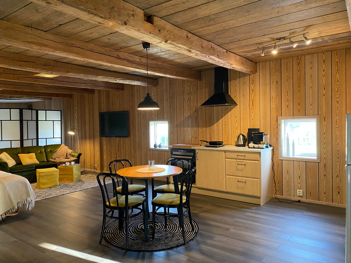 Skrzynka ładująca do samochodu elektrycznego. 15 minut jazdy samochodem do średniowiecznego miasta Arboga Prywatne wejście z podwórka. Do dyspozycji gości jest salon z widokiem na łąki i pastwiska dla koni. Piec opalany drewnem. Łóżko podłogowe o szerokości 1,2 m. Biurko. Fotele. Drzwi na taras. Jedna sypialnia z łóżkiem piętrowym. 2 szafy. Jedno okno. Pokój z telewizorem, aneksem kuchennym, kuchenką, kuchenką mikrofalową, lodówką i zlewem. Widok na dziedziniec na zachód. Toaleta i prysznic z widokiem na kościół. Blisko lasu z jagodami, grzybami i dziką przyrodą, urocze ścieżki spacerowe w okolicy.