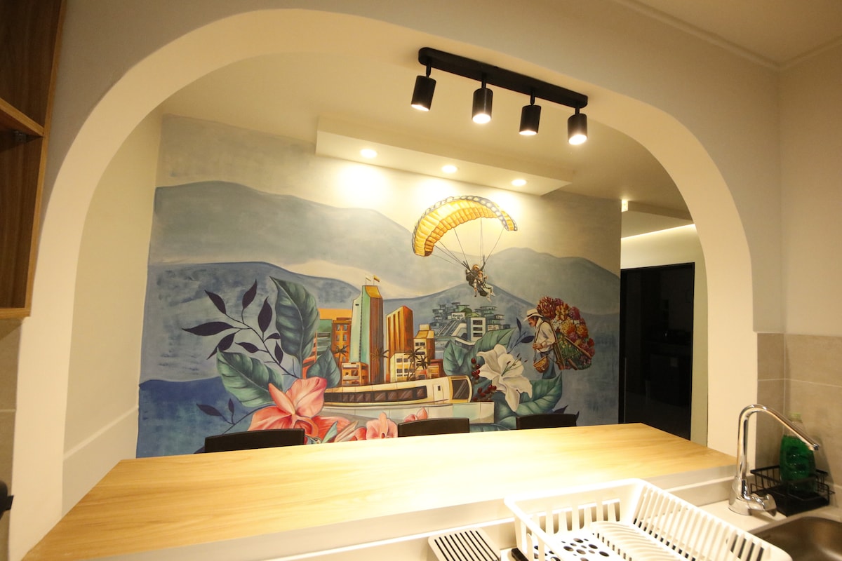 Nowo zaprojektowany apartament dwupoziomowy w Laureles z Wi-Fi i klimatyzacją