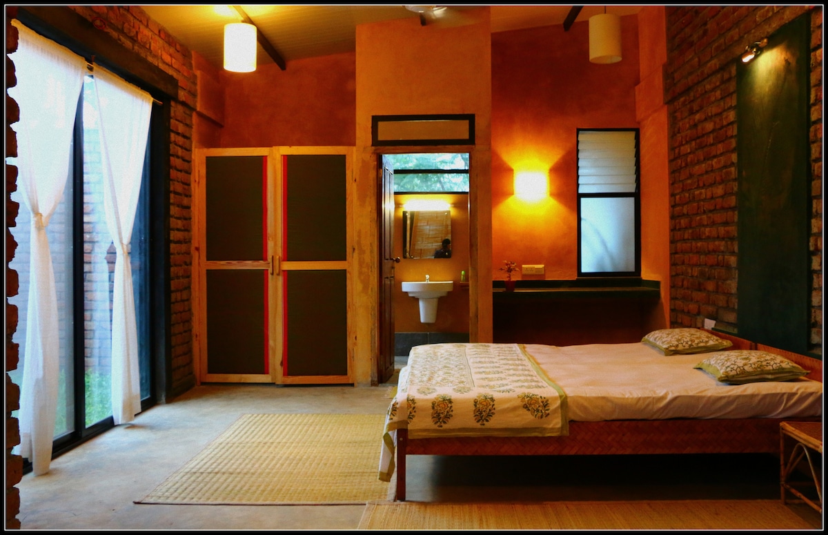 Our 7 acre farm, 11 kms from Nasik city, on Trimbak Rd, is home to three generations of our family. We offer you aesthetically designed bedroom suites, set amidst gardens & orchards. Each room has its own private courtyard, a comfortable sitting area and a writing nook. The attached bathrooms have an indoor and outdoor shower. Come and experience our organic farm, the slow life, browse our books, take a nature walk, make some art, linger over your coffee and let your mind wander....