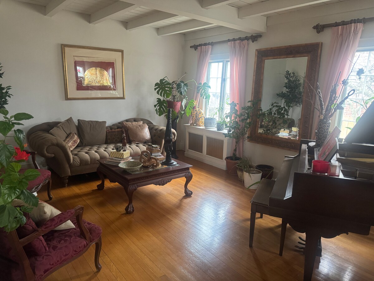 Drodzy goście, witamy w naszym przytulnym domu rodzinnym! Nasz wygodny dom ma dwa piętra i schody. Wszystkie 3 sypialnie znajdują się na piętrze. Na pierwszym piętrze znajduje się: 1 jadalnia, 1 kuchnia, 1 salon z kominkiem, 1 pokój biurowy i rodzinny, 1 łazienka z wanną z jacuzzi, 1 łazienka z prysznicem i dyszami do hydroterapii. Okolica jest całkiem bezpieczna i jest bezpłatny parking na ulicy. Znajdujemy się 15 min samochodem od lotniska JFK i 10 min pieszo do dworca kolejowego.
