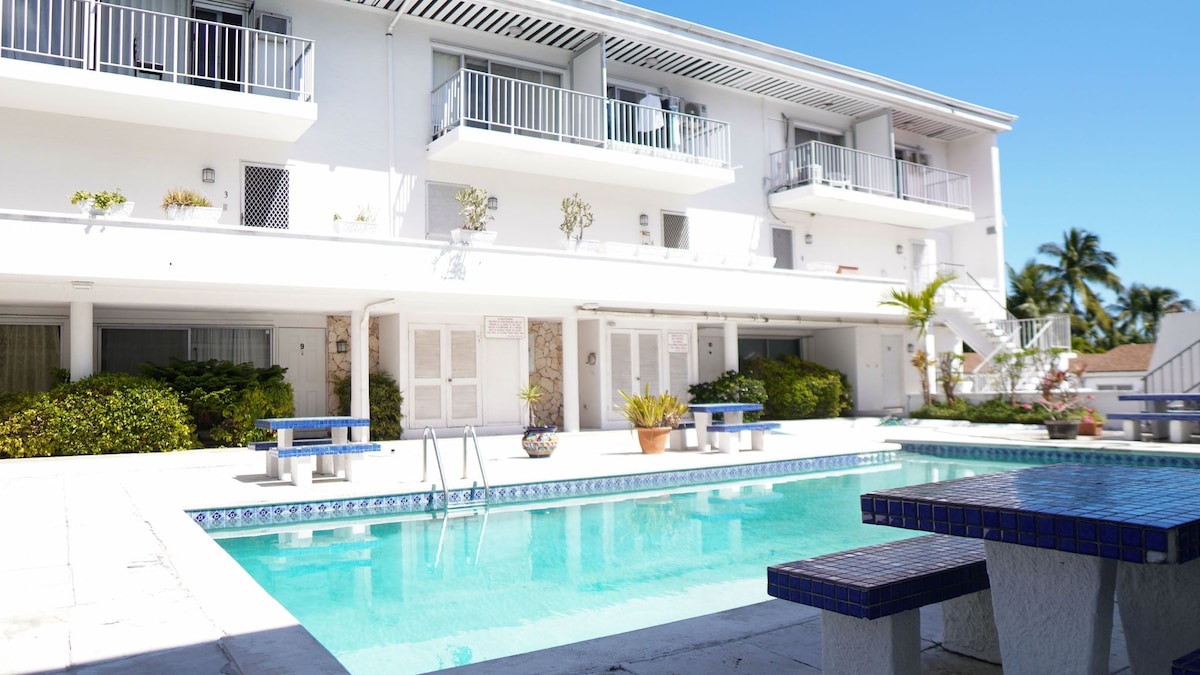 Nowoczesne mieszkanie z 1 sypialnią i 1 łazienką w ogrodzonym kompleksie z dostępem do basenu w Westridge, kilka kroków od sklepu spożywczego, 2 minuty spacerem do autobusu i kilka minut od Cable Beach, Baha Mar i lotniska. Wyposażenie obejmuje telewizor Smart TV ze streamingiem, szybkie Wi-Fi, generator zapasowy, bezpłatny parking, ekspres do kawy Keurig z kapsułkami, ręczniki plażowe, leżaki plażowe, sprzęt do nurkowania z maską i rurką oraz łóżeczko turystyczne na życzenie – idealne dla par i podróżujących samotnie odwiedzających Bahamy.