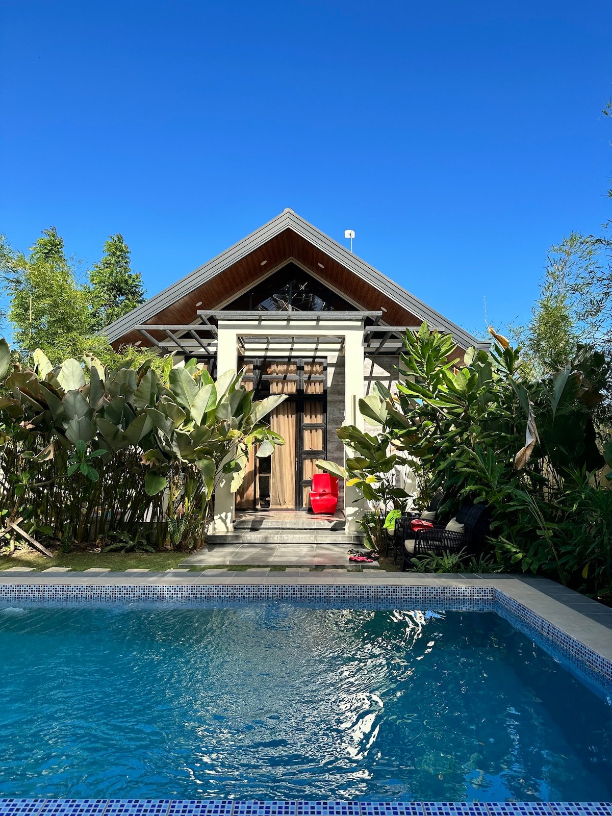 🌿 _Larue Pocket Villa_ to idealne tropikalne miejsce na odpoczynek – prywatna „Pocket Villa” w otoczeniu 500 m² bujnej zieleni pełnej tropikalnych roślin. Willa znajduje się na namorzynach (nie przy plaży). – Basen Infinity i prywatne jacuzzi (nieogrzewane, naturalne) do orzeźwiających kąpieli. – Wanna na świeżym powietrzu. – Altana z przestrzenią jadalną *plus videoke* (możesz śpiewać od 8:00 do 22:00) na spotkania towarzyskie.