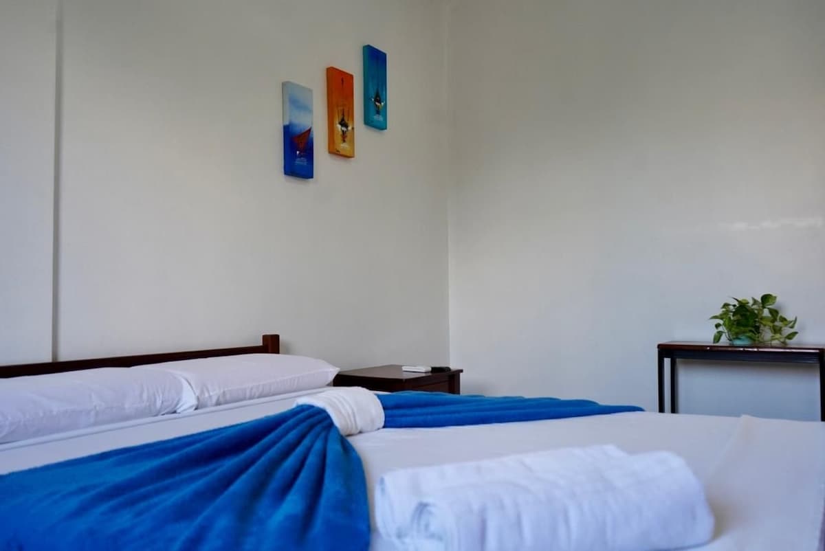 Relaxe em um espaçoso quarto triplo, perfeito para famílias ou amigos. Com uma cama de casal e uma de solteiro, o ambiente é bem arejado e climatizado, proporcionando conforto absoluto. Desfrute de uma vista tranquila da rua e do mar, além de Wi-Fi, TV, e frigobar.