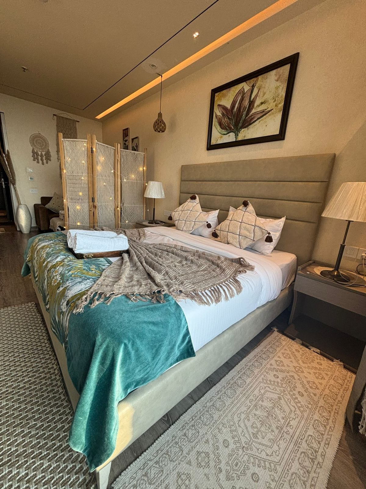 MES Secret Hide-out Bedroom with Lounge – znajduje się w sercu South Delhi-Gk1, z pięknym 1 BHK z dużą sypialnią z 65-calowym telewizorem i 2 x sofą z łóżkami i dołączoną toaletą. Oddzielny salon z kuchnią i sofą z telewizorem. Posiada również ogród z przodu z miejscami do siedzenia i ładnym widokiem na zachód słońca. Liczba miejsc do spania 4-7 osób. Całkowita powierzchnia: 1000 stóp kwadratowych. Uwaga: 7 kwietnia 2025 godzina zameldowania 17:30