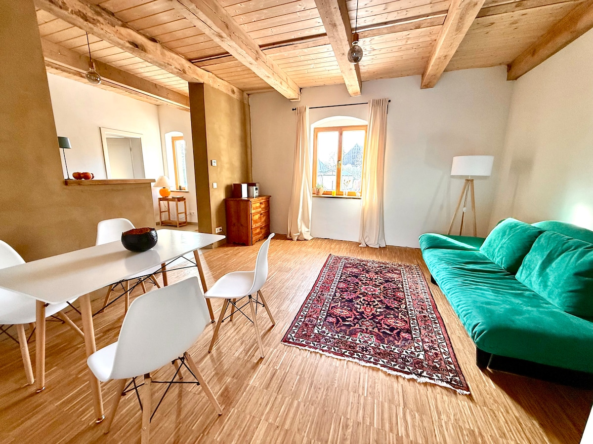 Jako profesjonalny twórca skrzypiec, mamy poczucie szczegółów. W naszym apartamencie dla gości stylowe barokowe elementy od początku domu łączą się z najnowocześniejszym wyposażeniem. Ta kombinacja gwarantuje autentyczność i przytulność. Podczas remontu staraliśmy się uzyskać jak najwięcej oryginalnej substancji. Całe ostrzeżenie: Niskie belki sufitowe z 1775 roku przecina przestrzeń.