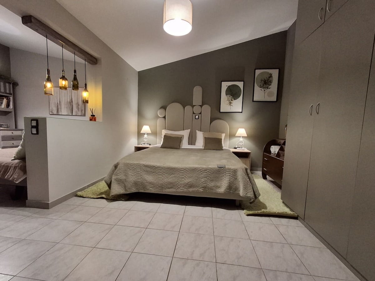 Apartament Kanathos to nowoczesny apartament na parterze, zbudowany w 2018 roku, położony w Nafplio, 1,5 km od centrum starego miasta. Posiada jedną sypialnię z łóżkiem typu Queen i loft z podwójnymi łóżkami, z możliwością podwójnego łóżka. Wyposażony jest w pełną kuchnię, piekarnik, płyty grzewcze, lodówkę, ekspres do kawy, toster itp. Posiada również taras o powierzchni około 30 m2 ze stołem i krzesłami odpowiednimi do relaksu. Zaprojektowane dla par i rodzin.
