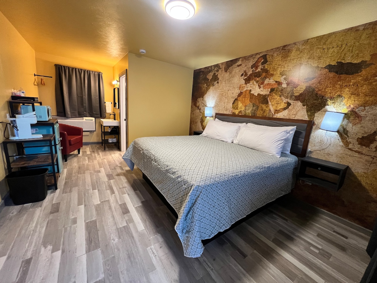 The newly renovated Orchard Motel is a themed room roadside motel along U. S. Route 20. Enjoy easy access to popular shops and restaurants, as well as The Ashfall Fossil Beds and Grove Lake Wildlife Management Area. The WORLD MAP ROOM features one king bed, a private bathroom with shower, TV, chair, and kitchenette.