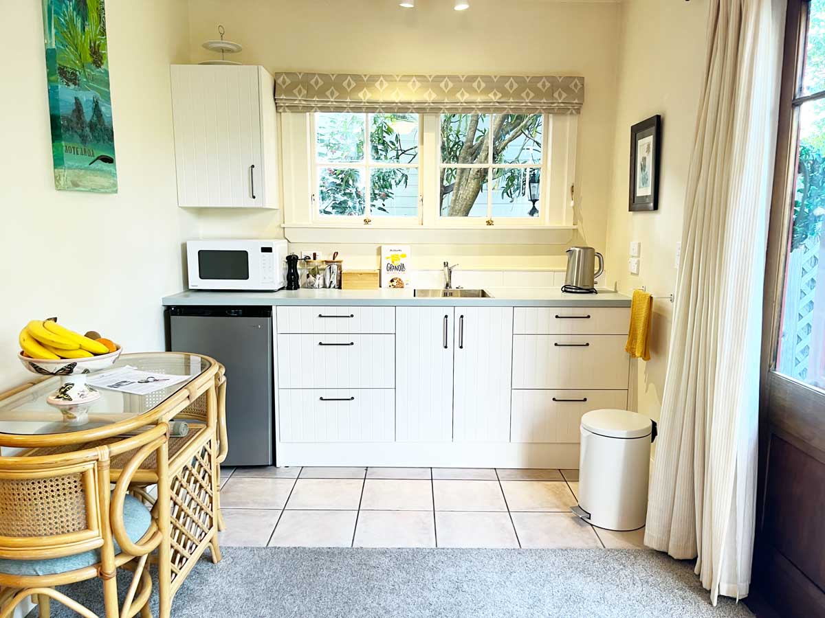 The Tintagel Cottage (pronounced Tin-ta-jel) is a luxury studio cottage located in a tranquil garden setting at the rear of an historic 4 bedroom home, situated in a historic area in Nelson known as ‘The Dress Circle’. The owners, Kay and Simon reside on-site, and have enjoyed hosting visitors at the cottage for over 15 years. Intimate and cosy, north-facing French doors open onto an established garden, with large native trees and shrubs, home to an abundant birdlife.