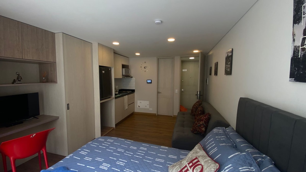 Zrelaksuj się w nowoczesnym i przytulnym lofcie – nieskazitelnym i wyposażonym we wszystko, czego potrzebujesz, aby poczuć się jak w domu. Oferuje szybkie WiFi, w pełni wyposażoną kuchnię i bardzo wygodne łóżko, idealne na krótkie lub długie pobyty. W budynku znajduje się wspólny taras na dachu z widokiem na miasto, przestrzenie coworkingowe i recepcja czynna całą dobę. Położone w Chapinero, centralnej i dobrze skomunikowanej dzielnicy Bogoty. Znajdziesz tu świetne kawiarnie i restauracje. Uprzejma i przyjazna komunikacja przez cały pobyt.