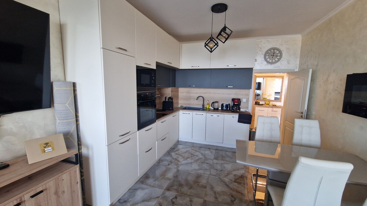 Wyjątkowo piękny apartament w Nessebar City. 5 minut spacerem od South Beach i 10 minut od Sunny Beach, 15 minut do Nessebar Old Town, centrum handlowe, restauracje i supermarkety za rogiem. Apartament jest dobrze wyposażony, 2 sypialnie dwuosobowe, otwarta kuchnia, łazienka jako niewielka strefa wellness. Na przestronnym tarasie o powierzchni 20 m2 z ochroną przeciwsłoneczną można spędzić czas bez przeszkód na dachach Nessebar z widokiem na Bałkany.