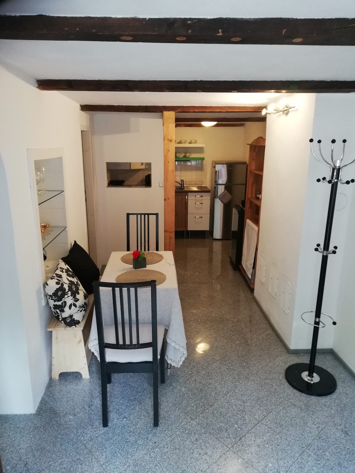 Mały, ale przytulny apartament (190 stóp kwadratowych) z oddzielnym wejściem, 1 pokój, mały aneks kuchenny, lodówka, łazienka i mały taras. Jeśli podróżujesz samochodem, poinformuj nas o tym z wyprzedzeniem. Dobre połączenie autobusowe ze starym miastem. Opłata klimatyczna w wysokości 3,55 euro płatna gotówką na miejscu.