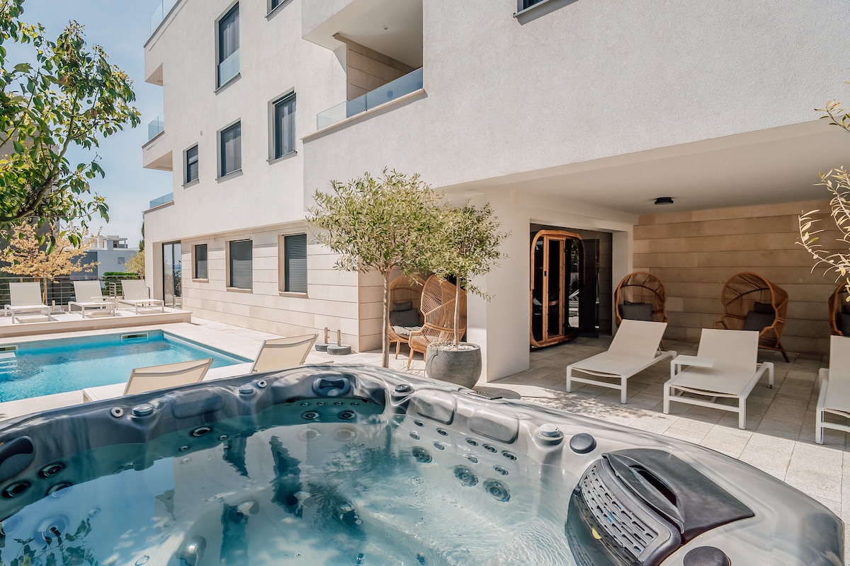 GT is spacious top floor apartment, with 2 private rooftop terraces, featuring outdoor Jacuzzi. There are 2 en suite bedrooms, kitchen,dinning/living area with a fireplace. Second floor features a study/office room which opens to two rooftop patios, one for lounging and enjoying the Jacuzzi, while the other has an outdoor kitchen with a traditional wood burning grill and an outdoor dinning area.