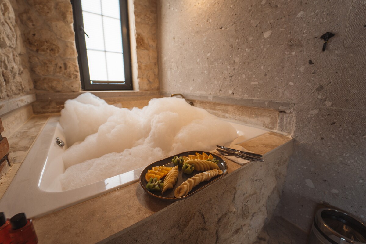 W magicznej atmosferze Kapadocji luksusowe pokoje z jacuzzi i ogrodem oferują wyjątkowe doświadczenie, w którym komfort i elegancja spotykają się na najwyższym poziomie. Łączy w sobie zabytkową kamienną architekturę i nowoczesne detale, zapewniając każdemu gościowi niezapomniany pobyt. Słuchając dźwięków przyrody, oferuje idealną atmosferę, aby poczuć się odświeżonym. Oglądanie wschodu słońca lub spędzenie romantycznego wieczoru pod gwiazdami to tylko kilka z legendarnych atrakcji, które oferuje ten pokój.