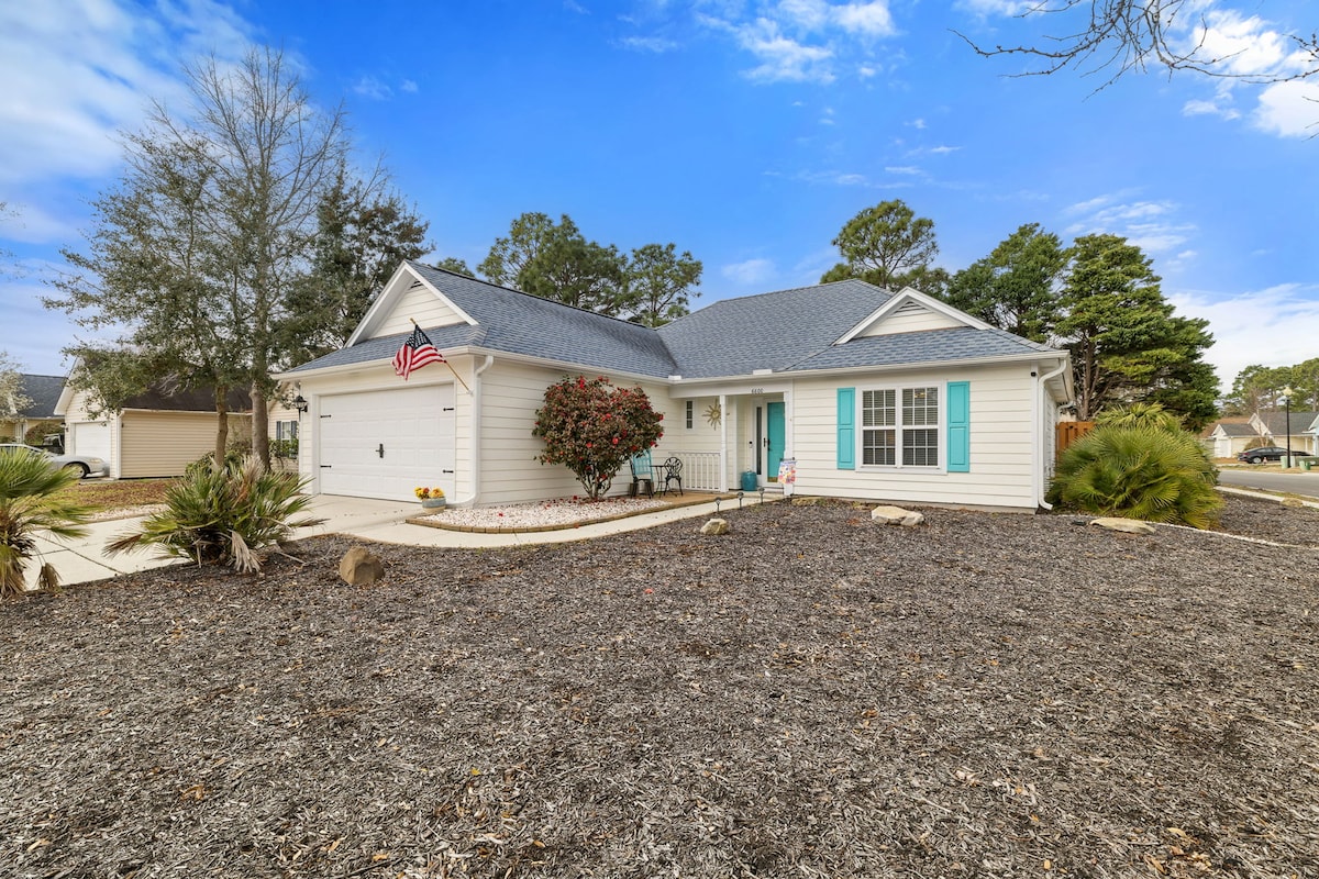 Wejdź w spokój w tym pięknie urządzonym domu zaledwie 2 1/2 mili od Wrightsville Beach, NC! Idealnie położony na greenie dołka nr 3 pola golfowego Inland Greens, które jest trudnym polem par 3. Główna część dzienna znajduje się po prawej stronie, gdy wchodzisz, kuchnia ze wszystkimi niezbędnymi rzeczami, jadalnia z miejscami siedzącymi dla 6 osób i główna część dzienna z dużym telewizorem z płaskim ekranem. Główna sypialnia i łazienka znajdują się po lewej stronie domu, a druga i trzecia sypialnia z tyłu.