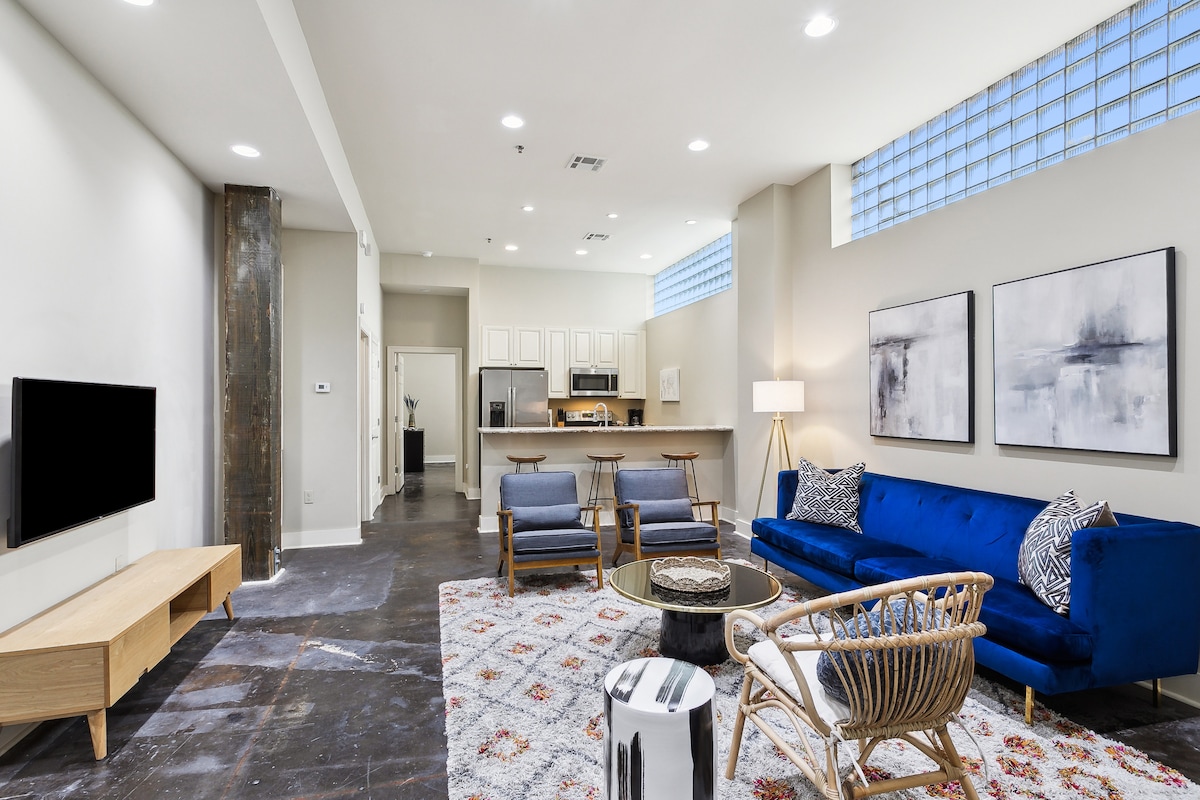 Fully furnished, luxury condo at the edge of the CBD, located on the 5th floor of a very upscale, safe, and secure building right near downtown and I-10. Unit is a bright and sunny 1 bedroom, 1.5 bath; bedrooms and living room all have high ceilings and windows with a sweeping view of the city. The unit is equipped with a luxurious queen sized sofa sleeper as well in addition to the large king sized bed. Walking distance to Superdome, Arena and many of New Orleans most famous attractions.