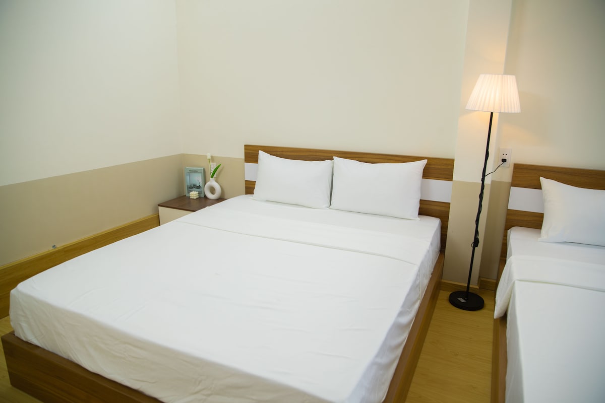 To przytulne, nowoczesne studio z widokiem na ogród, zaledwie 5 minut od lotniska Tan Son Nhat, położone w spokojnej, bezpiecznej dzielnicy mieszkaniowej. W pełni wyposażony w klimatyzację, aneks kuchenny, miejsce do pracy i duży telewizor Smart TV, oferuje spokojny pobyt. Ciesz się elastycznym zameldowaniem/wymeldowaniem dzięki prywatnemu zautomatyzowanemu systemowi drzwi. Zaledwie 20 minut taksówką do ulicy Nguyễn Huệ Walking Street i w pobliżu lokalnych restauracji i parku Hoang Van Thu na poranne ćwiczenia.