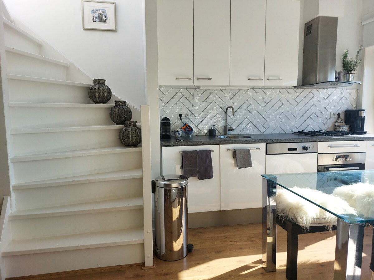 Słoneczny apartament na drugim piętrze, gustownie urządzona, w pełni wyposażona kuchnia w doskonałej lokalizacji w modnej okolicy. Dom z dala od domu. 15 minut spacerem do centrum, 10 minut do dworca głównego. Zaskakująco cicha okolica ze względu na swoją centralną lokalizację. Świetny taras na dachu z 360-stopniowym widokiem na Utrecht, z rozkładaną sofą i grillem. Płatny parking na ulicy, ale od piątku 11:00 do poniedziałku 6:00 bezpłatny parking w okolicy.