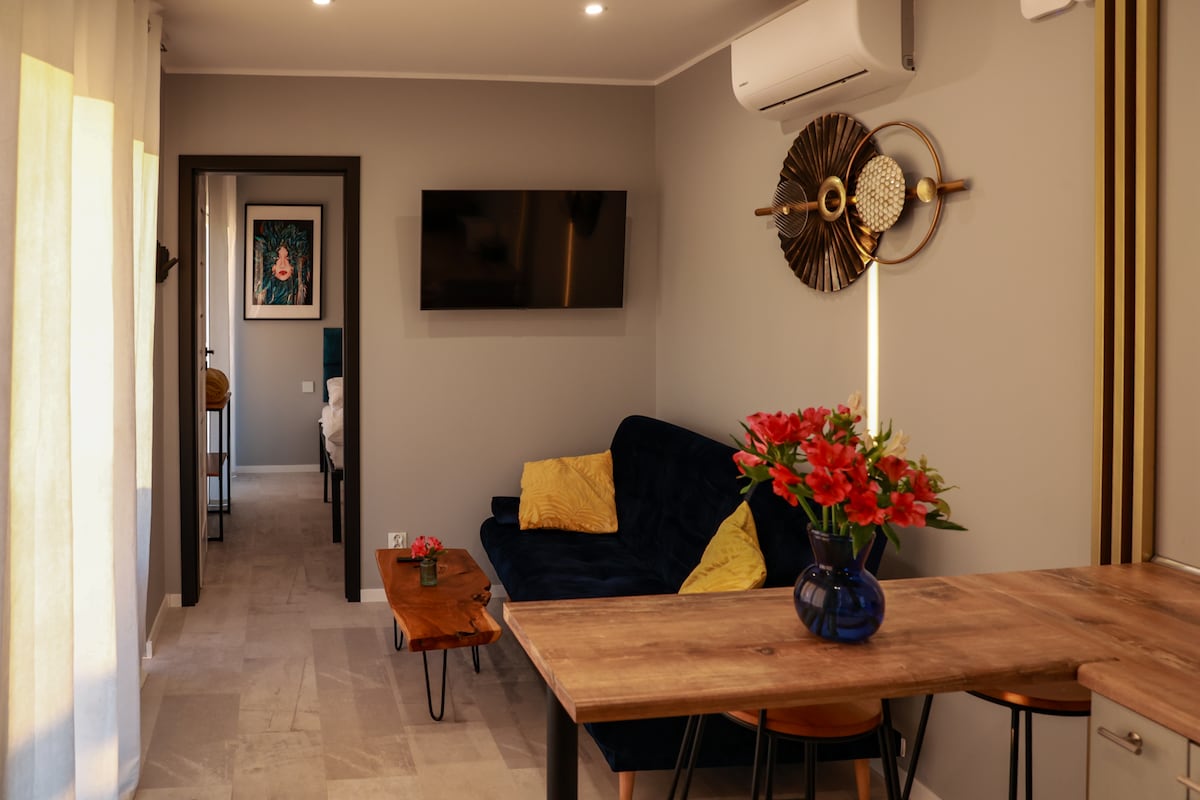 To nowoczesne mieszkanie o powierzchni 27,70 m² oferuje komfortowy pobyt w przestronnym salonie (17,24 m²), w pełni wyposażonej kuchni (4,34 m²) oraz eleganckiej łazience (6,12 m²), która łączy wannę z kabiną prysznicową, podświetleniem LED, oraz nowoczesnymi wykończeniami. Kuchnia została wyposażona w najwyższej klasy sprzęt AGD: lodówka w zabudowie, piekarnik, płyta ceramiczna oraz teleskopowy okap, a dodatkowe oświetlenie LED RGB pod szafkami wprowadza wyjątkowy klimat.