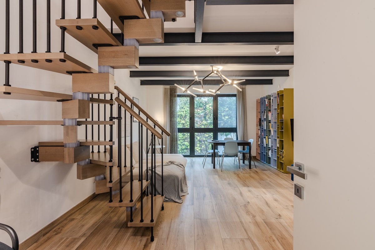Loft z ogrodem położony w ekskluzywnej lokalizacji, kilka kroków od metra i transportu publicznego. Jasna, otwarta przestrzeń na parterze jest w pełni wyposażona. Kuchnia i przestronny salon, rozkładane łóżko i szafa garderoba zapewniają maksymalny komfort. Cichy apartament z wewnętrznym dziedzińcem znajduje się w całości biostabilnym budynku, zaprojektowanym w celu zmniejszenia wpływu na środowisko. Idealne na relaksujący i zrównoważony pobyt.