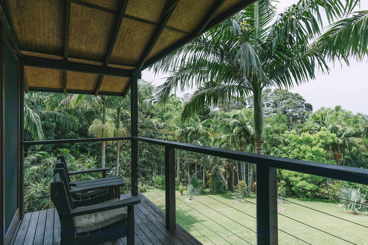 Beautiful spacious ultra modern cottage set in 5 acres of exotic sub tropical botanical gardens with natural pockets of rainforest and creek, where you can forget yourself and simply be. A stunning, fully fenced private space for up to 4 people to relax and enjoy the peacefulness of the surrounding Balinese water Garden and your own private plunge pool and 5 person hot tub in a beautiful gazebo. Totally peaceful space, but only 15 minutes to Mullumbimby, Brunswick Heads and ocean beaches