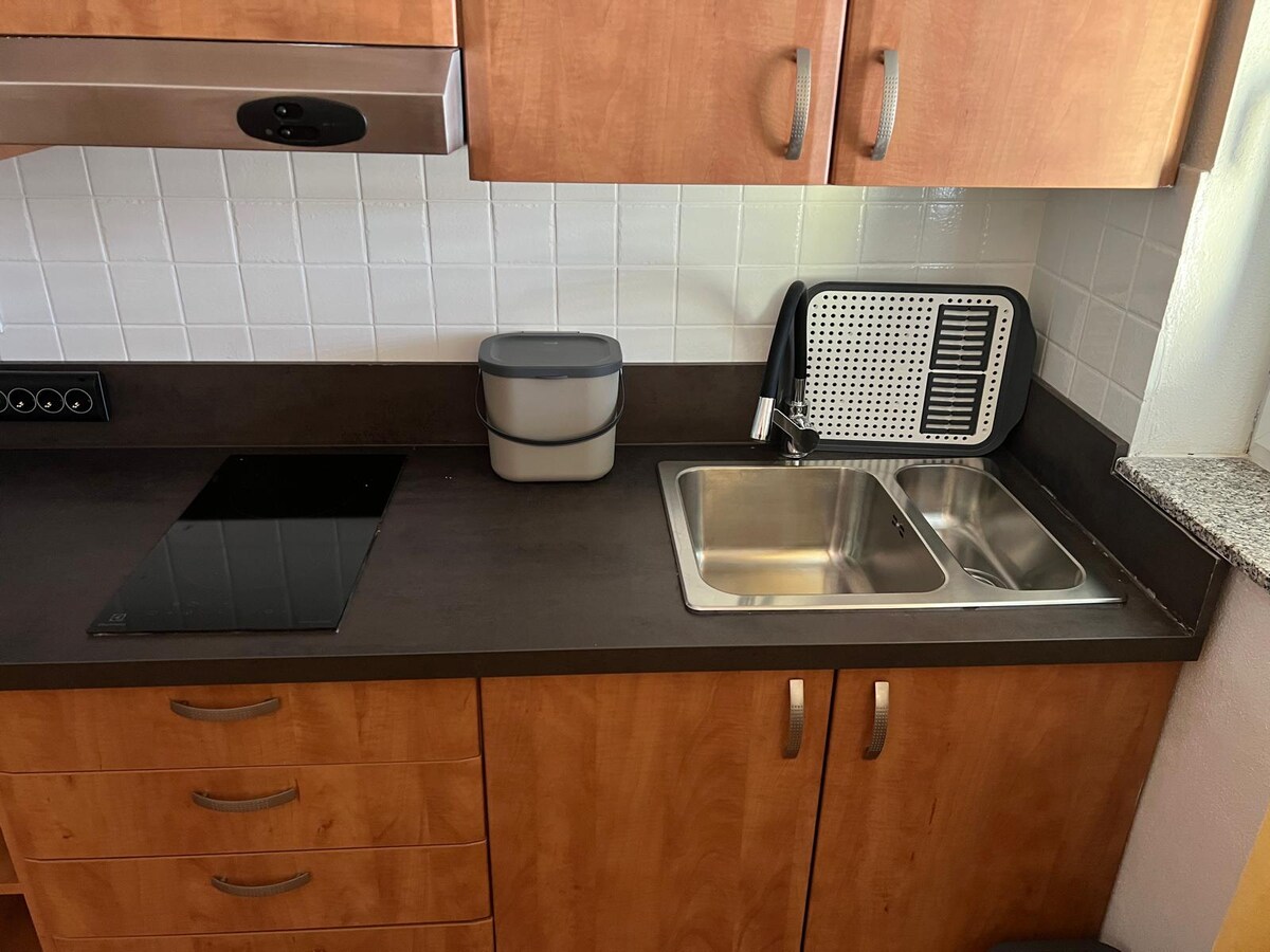 Nowe mieszkanie dla 4 osób znajduje się na 2 piętrze budynku mieszkalnego, o łącznej powierzchni 45 metrów kwadratowych. Składa się z balkonu, salonu, kuchni i jadalni (w tym samym pokoju), 2 sypialni oraz łazienki z prysznicem i pralką. Kuchnia jest w pełni wyposażona w naczynia, ściereczki kuchenne, zmywarkę, lodówkę z zamrażarką, kuchenkę mikrofalową, ekspres do kawy i czajnik. Apartament wyposażony jest również w internet, telewizję satelitarną i klimatyzację.