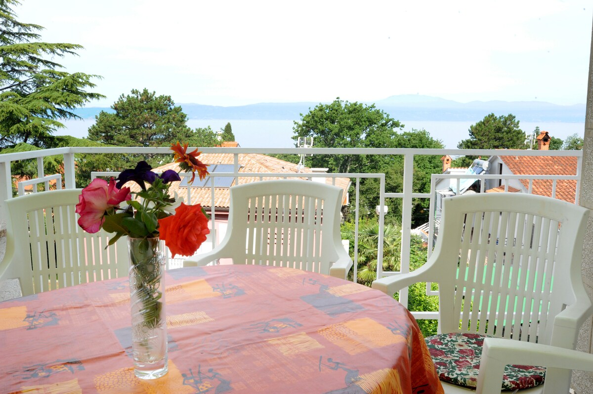 The apartment is located on the secon floor with a huge terrace that has an unobstructed view over the Kvarner bay. You can enjoy this spectacular view from your dining room, master bedroom and secondary bedroom. The beach is only 200 meters away. The apartment consists of: Main bedroom with comfortable Queen size bed The secondary bedroom has two single beds and a work desk Kitchen with a dining table. Bathroom Terrace and a balcony One parking space and WiFi are available and free to use.