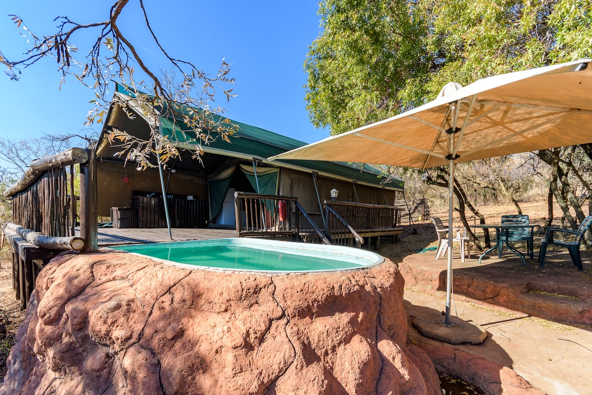Luxury 2-Sleeper Tent with Pool: Our Aquila tent is uniquely located on a natural elevation in the escarpment, providing magnificent views of the surrounding cliffs, the crystal-clear pond in the mountain stream and the forested valley below. The plunge pool adjoining the deck overflows with pristine, natural earth water that streams out of a fountain on the high ground and is aerated by the waterfall while flowing down the ravine.