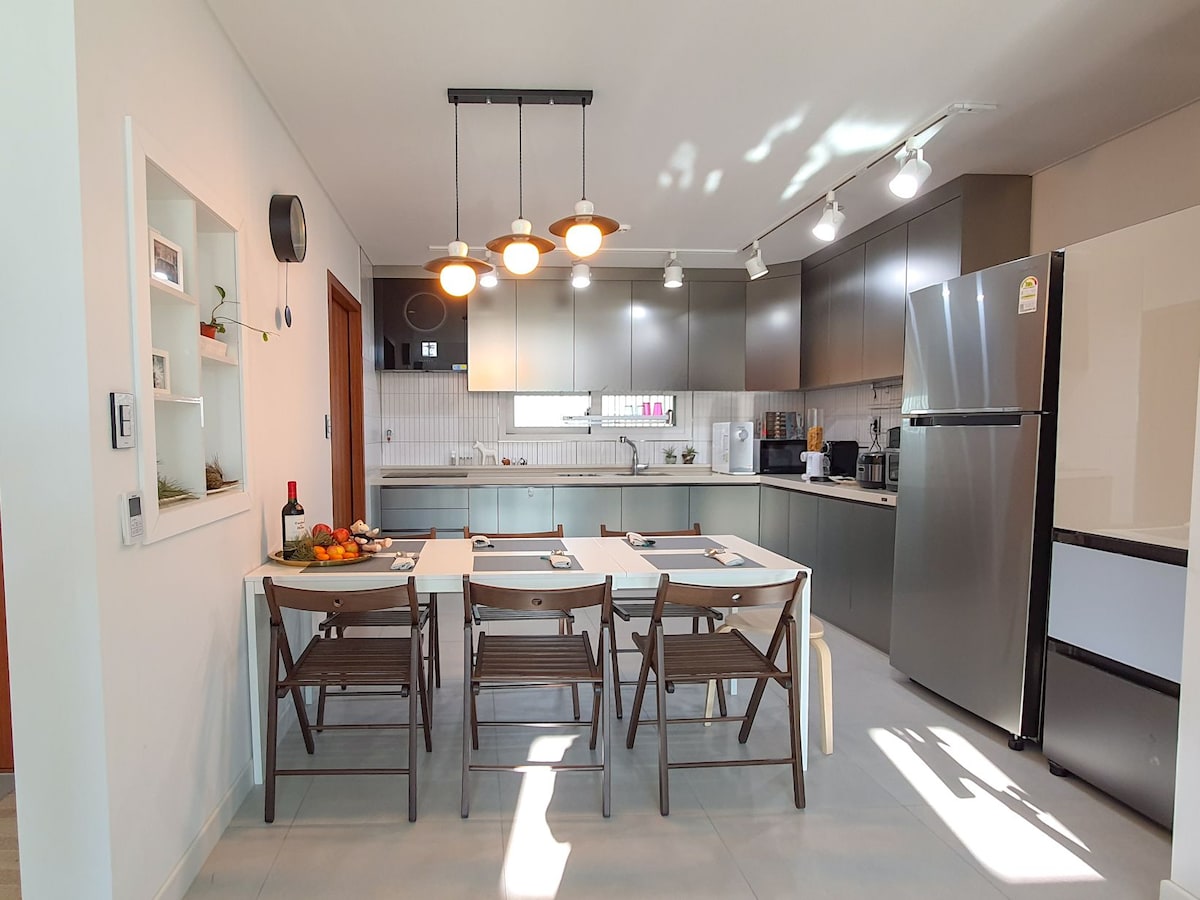 숙소에서 자동차로 3분거리의 바다 200평의 넓은 대지위에 25평의 안락한 오직 한팀만을위한 비대면 독채감성숙소입니다 넓은 도로옆의 마을입구이지만 민가와 50여m떨어져있어 주변의 시선과 소음을 전혀 방해받지않는 비대면의 프라이빗한 숙소입니다 침실 두개는 퀸사이즈침대와 슈퍼싱글 사이즈 2개를 준비하여 정원 4분이 편히 쉬실수 있는 공간을 준비하였으며 추가인원이 있을시 1인은 거실에 침구를 마련해 드립니다 선명한 8k 85인치 대형TV 로 넷플릭스의 영화를 즐길수있습니다 바닷가와의 거리도 차로 3분거리 서프비치 12분거리의 숙소입니다 주차후 정원에 낮고 예쁜 계단이 20개 있습니다 혹시라도 불편하신 게스트님은 예약중 참고하세요