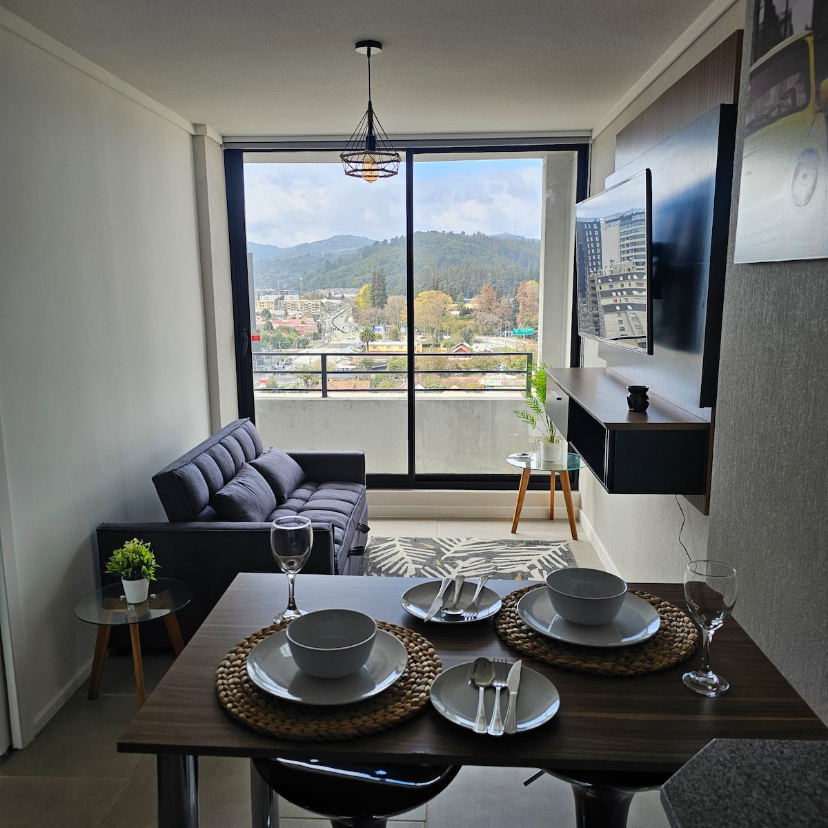 Witaj w tymczasowym mieszkaniu w Concepción 🏢 Ciesz się nowoczesną i przytulną przestrzenią z 3 wygodnymi łóżkami, wyposażoną kuchnią i tarasem z widokiem. Co Ci się spodoba w tym miejscu: Bezpłatny prywatny parking Smart lock do samodzielnego zameldowania Supermarkety, apteki i transport w odległości 5 minut Szybkie Wi-Fi, Smart TV i w pełni wyposażoną kuchnię z kompletnymi naczyniami Bezpieczeństwo 24h Idealne na wyjazdy służbowe, rodzinne wypady lub pobyty studenckie.