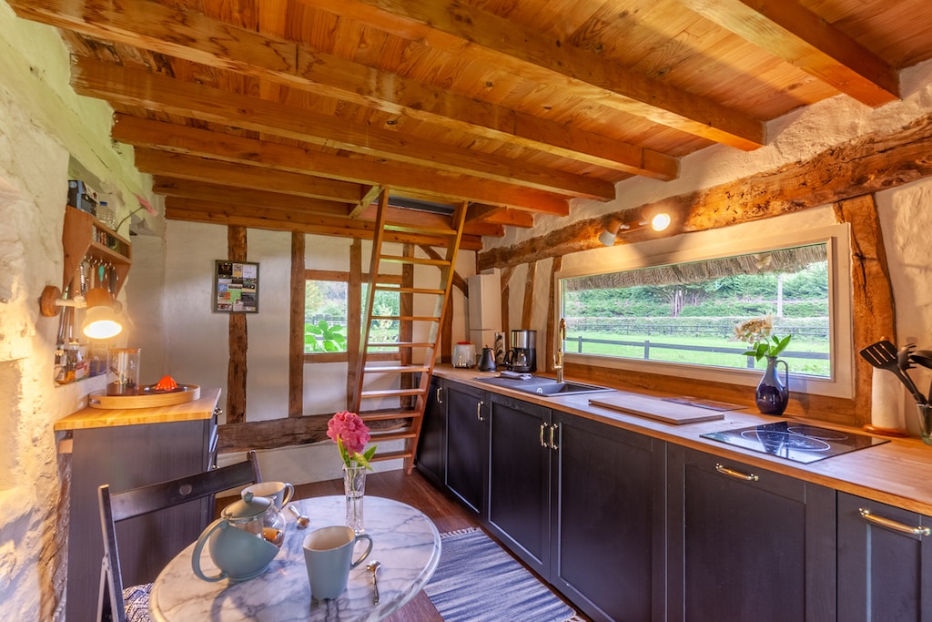 Uroczy, zabytkowy piec chlebowy z muru pruskiego, położony nad brzegiem strumienia, składa się z: - Salon z piecem na drewno, - Kuchnia - Na piętrze: - łazienka z prysznicem i WC, do której wchodzi się po drabinie (patrz zdjęcia), - pokój z łóżkiem 160x200 z widokiem na strumień, do którego prowadzi drabinka (patrz zdjęcia), Sypialnia i łazienka nie są ze sobą połączone. Meble ogrodowe, grill, prywatny parking, drewno opałowe wliczone w cenę Inny domek, Maison de pierres, znajduje się w odległości 100 m.