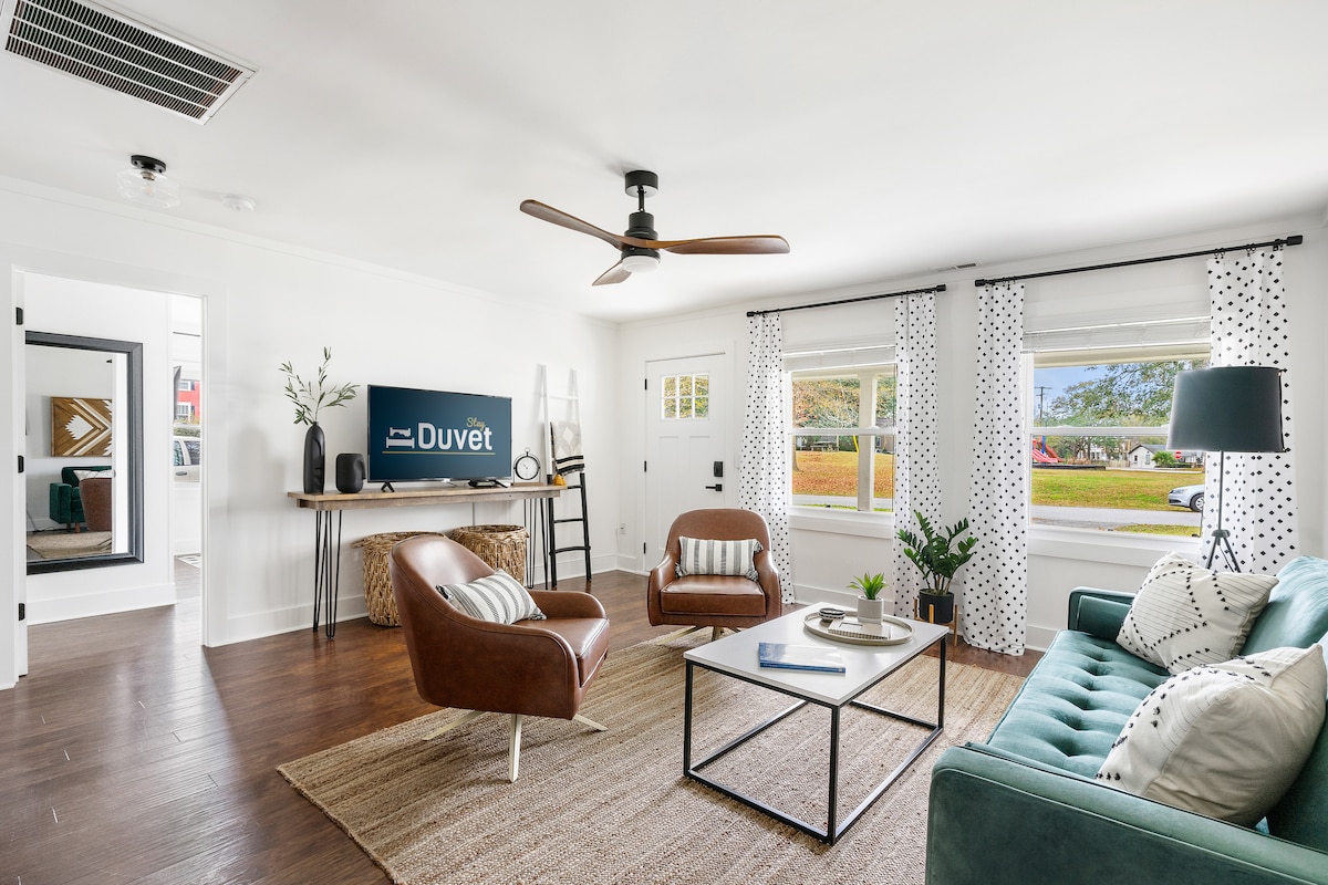 Walk to Park Circle’s top restaurants, breweries, and parks from this fully renovated 2BR home! This home blends modern comfort with unbeatable location. Downtown Charleston is just 10–15 min away, the beaches Sullivan's Island, Isle of Palms, Folly Beach- 25–35 min away. Walk to Riverfront Park and Firefly. Steps from Park Circle Playground- the world’s largest inclusive playground. Train line behind the fenced in yard adds character; sound machines provided for light sleepers.