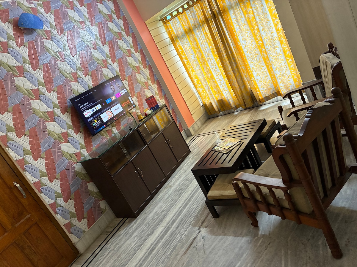 Uwaga – pary niebędące w związku małżeńskim nie są dozwolone. Zapomnij o swoich zmartwieniach dzięki tej przestronnej i spokojnej willi. W tym miejscu zauważysz przebłysk Bengalu. Posiada salon z 6-osobową sofą, stolikiem, odtwarzaczem muzycznym Bluetooth i umywalką. Duża kuchnia z piekarnikiem gazowym, kuchenką mikrofalową, tosterem, naczyniami, szybkowarem, lodówką i stołem jadalnym z krzesłami. 1 łazienka z gejzerem. 2 sypialnie z dwoma klimatyzatorami, 2 podwójne łóżka, szafy, 2 stoliki boczne, telewizor i kącik roboczy z krzesłem biurowym i stołem. (Szybkie WiFi)