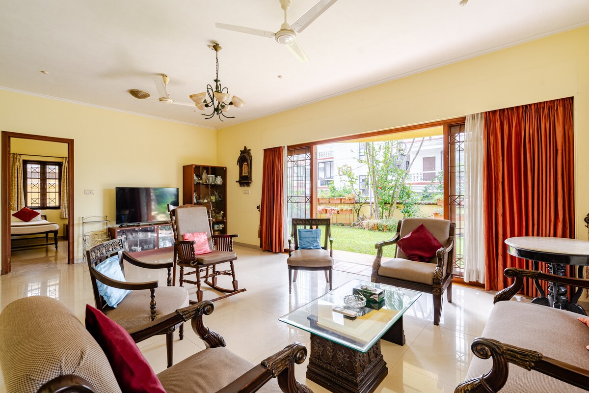 Piękna jedna sypialnia/hol/Domek kuchenny przymocowany do 150 letniego portugalskiego domu, położonego przy drodze Calangute-Baga. Domek ma oddzielne wejście i ma własne prywatne siedzieć i wychodzi na przyprawy i ogród owocowy. Idealny do siedzenia i delektowania się filiżanką chai. Jest tu też aneks kuchenny i salon. Mały kawałek samotności w Calangute. W pobliżu domku znajduje się restauracja z mikrobrowarem i ogrodem, a goście zachęcani są do wypróbowania ich.