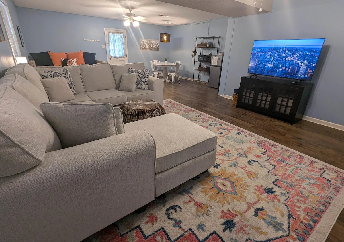 Apt is 1 of 4 in a bldg 100' behind our home on 5 acres in a beautiful valley near the end of a private, tree-lined, dead-end rural road near LRAFB & Pine Valley Golf Course, secluded & quiet yet close to the city. 560sf apt has a 190sf BR with king bed, 50" fs smart TV, ceiling fan, & closet; 80sf full bath/laundry; 280sf LR/full kit w/ service for 6, 65" fs smart TV, ceiling fan, queen sofa bed, love seat rocker/recliner w/ console; all wrapped in foam insulation for max sound barrier.