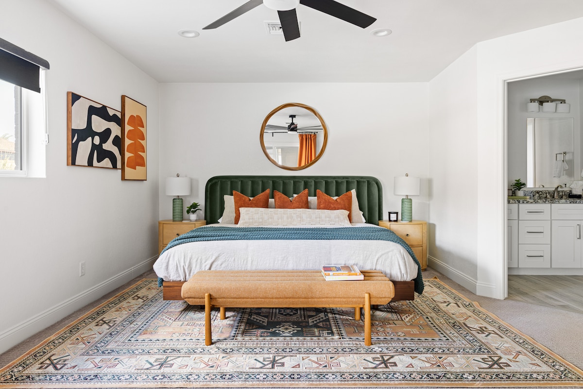 Witamy w The Hidden Hacienda Scottsdale! Zabawne, kapryśne miejsce z kowbojskim wystrojem, basenem, spa, karaoke i grami – idealne na wieczór panieński, dla rodzin lub na wypoczynek dla golfistów. 10 miejsc do spania z wygodnymi łóżkami, telewizorami Smart TV, stołem bilardowym i w pełni wyposażoną kuchnią. Zrelaksuj się pod palmami, poćwicz uderzenie na minigolfie lub zrelaksuj się na prywatnym podwórku z przytulnym paleniskiem i telewizorem na zewnątrz. Kilka minut od Kierland Commons, najlepszych pól golfowych, Spring Training i wielu innych atrakcji!