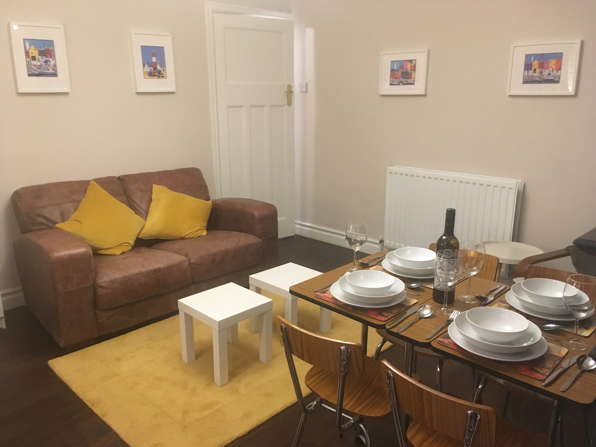 Przytulne mieszkanie z dwiema sypialniami na pierwszym piętrze, które jest dobrze wyposażone, aby zaspokoić wszystkie potrzeby związane z wyżywieniem. Pięknie urządzony. Przedni pokój jest komfortowy, jasny i przewiewny. Jest tam stół do pracy lub do spożywania posiłków, telewizor Smart TV, Sky, internet szerokopasmowy i DVD. Kuchnia i łazienka są dobrej wielkości i wyposażone we wszystkie udogodnienia, których potrzebujesz. Obie sypialnie są przestronne, z dużą ilością szuflad i szafą do użytku. Jest mały ogród z patio.