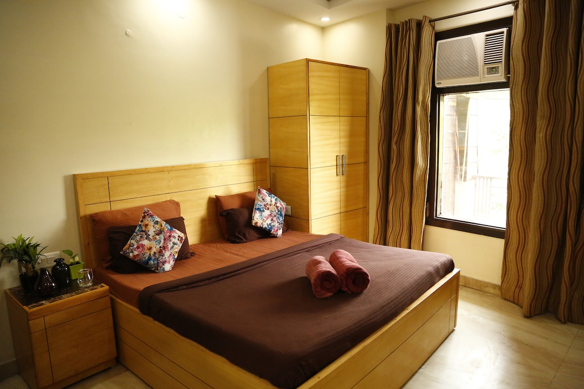 Witamy w Sadharan Homestays! Nasz elegancki apartament 4BHK w Kailash Hills oferuje komfortowy pobyt, idealny na spokojne spotkania rodzinne i przyjacielskie. Głośne imprezy są niedozwolone. Znajduje się na pierwszym piętrze bez windy, a nasz całodobowy personel pomaga z bagażem i nie tylko. Ciesz się bezpłatną usługą kucharza, który przygotuje domowe posiłki. Wszystkie 4 sypialnie mają dołączone łazienki, 3 z balkonami. Mieszkanie jest klimatyzowane za pomocą 5 klimatyzatorów na gorąco i zimno, co zapewnia komfort o każdej porze roku. Zaoszczędź 18% na rezerwacjach biznesowych dzięki fakturze GST!