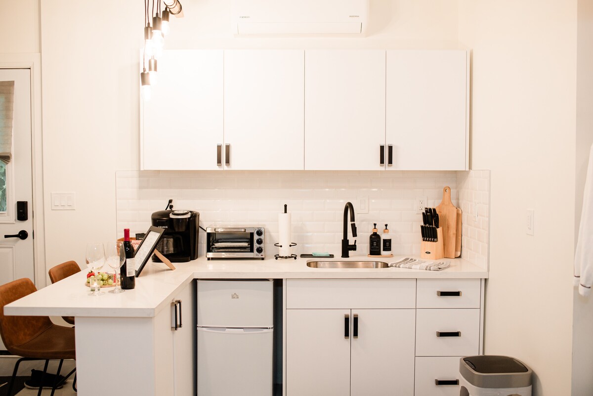 Kick back and relax in this calm, stylish space. 10 minute walk to History! 15 minute walk to the beach! Complete with kitchenette, 3 piece bathroom, and an upstairs bedloft (watch your head - 5'3"). There's a queen bed upstairs and a Spaze pullout sofabed downstairs. Rounding out the space is a TV, highspeed internet, and a minisplit ductless AC/heat pump. Linens and towels are provided. Please note steep stairs and low headroom in the loft. Operator Registration STR-2109-FMGHHC.