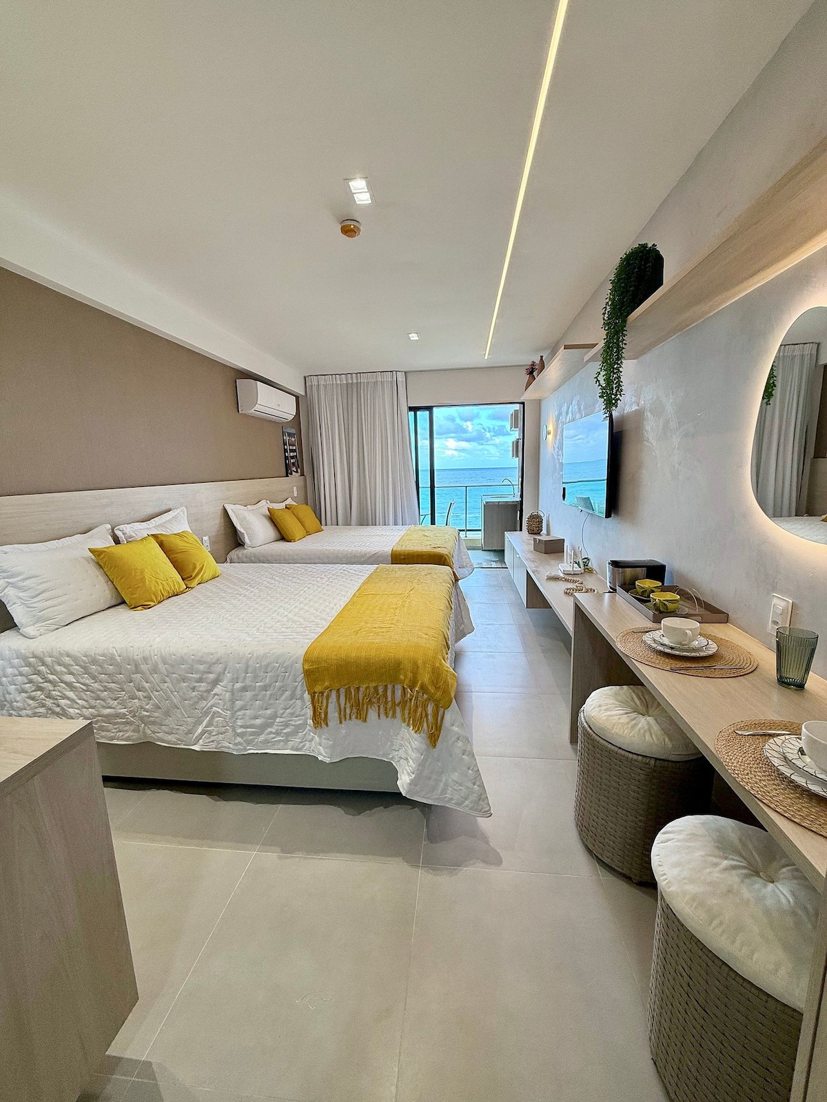 Studio no Marulhos Suites Resort. Cama queen, bicama, colchão extra, ar condicionado, internet boa e smart tv. A cozinha conta com geladeira, Gelágua, cafeteira, sanduicheira e os demais utensílios de cozinha. Apto aconchegante de frente para as piscinas. O hotel é de primeira, conta com várias piscinas, sauna, academia, campos de futebol e tênis, área de jogos e recreação todos os dias para a criançada. Ja tenho alguns anos alugando esse e outros flats em muro alto, então pode confiar!