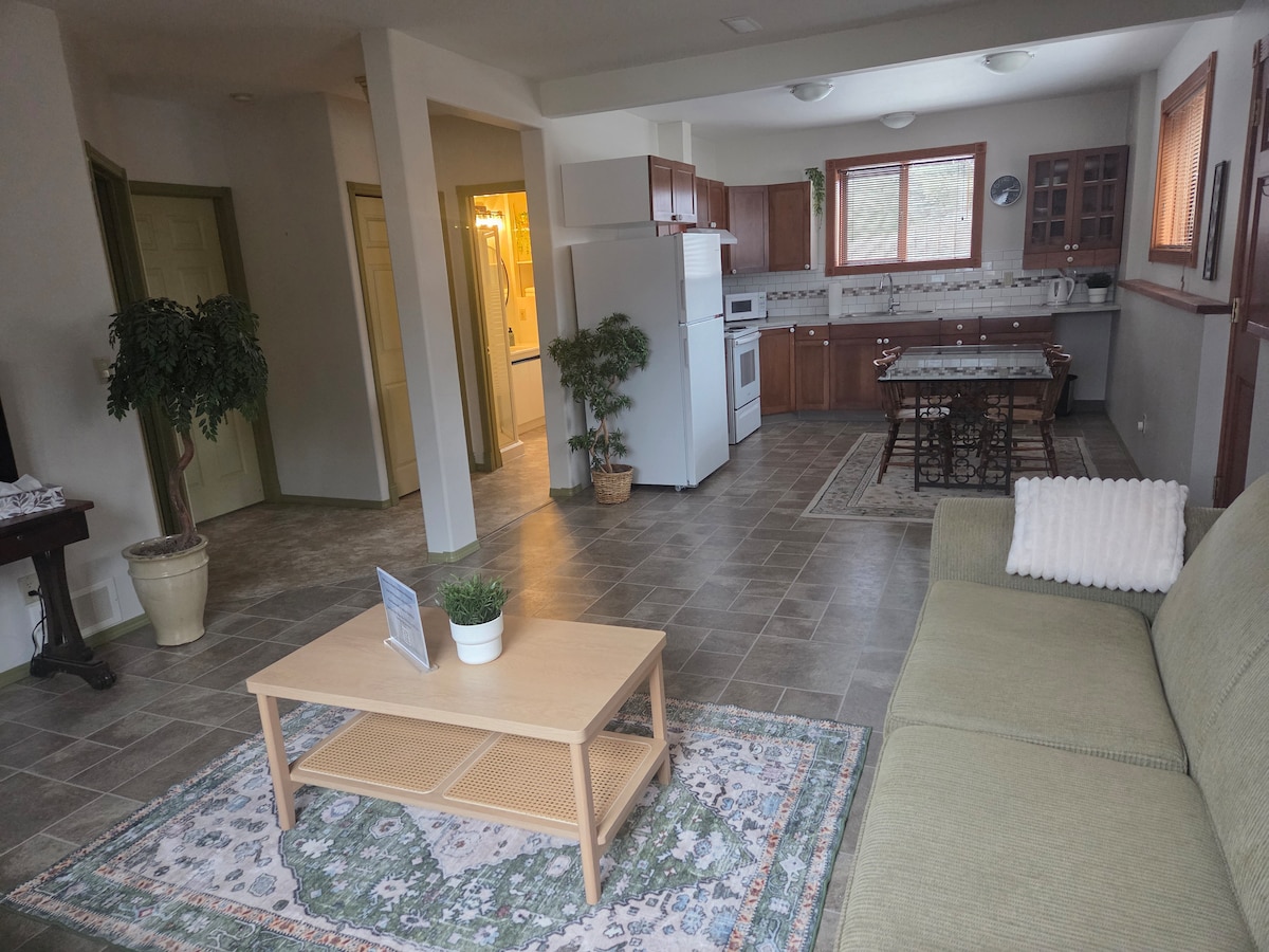 Next to the rail-trail, 30min to Nelson, central to 2major ski areas and 5min. from night skiing in Salmo, close to many beautiful lakes in the area. This spacious suite can accommodate 4-5 persons as it has a Queen bed, a high-end pullout sofa and twin cot. It has a beautiful shower room and a well appointed kitchen and new appliances for you to cook with. Floor heating keeps you cozy and warm and the big windows make you feel being part of nature. It also has a barbeque on the covered porch.