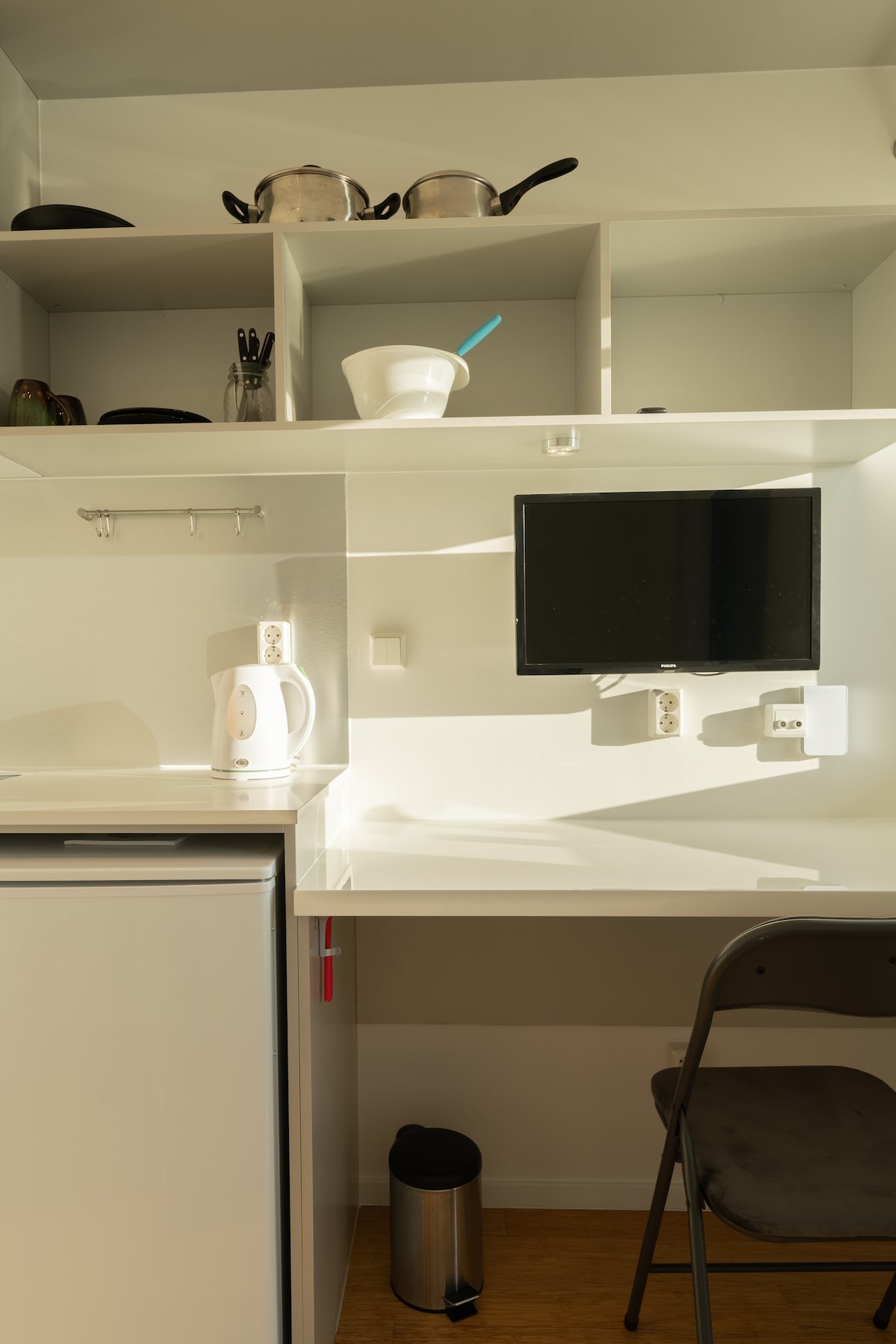 This beautiful 5th floor Studio with Balcony has a functional kitchen equipped with a stove, fridge, dishwasher, microwave, coffee maker, kettle and tableware. An elegant bathroom with shower and a hairdryer makes the stay comfortable. Some apartments have their own washing machines, but there's also a shared laundry room with easy access for those apartments that don't. High-quality beds will guarantee a relaxing night's sleep for 1 or 2 people. Room price includes Wi-Fi, linens and towels.