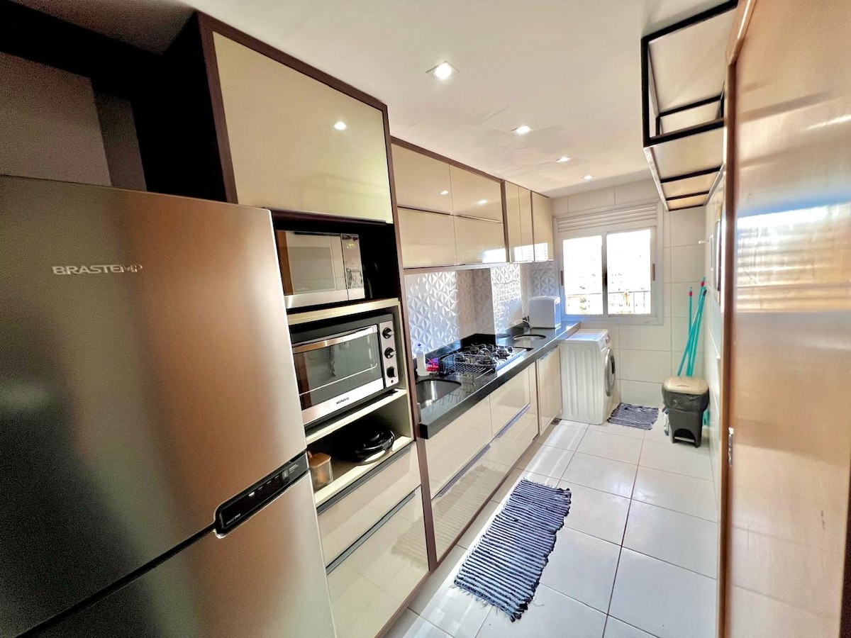 Apartamento sofisticado, extremamente limpo e cheiroso, com roupas de cama e toalhas esterilizadas. Totalmente equipado: cozinha completa com utensílios, forno elétrico, micro-ondas, chaleira, sanduicheira, liquidificador, geladeira e máquina de lavar. TV 4K 55”, Wi-Fi rápido, ar no quarto, ventiladores e climatizador. 3 camas. Banheiro com secador. Fechadura eletrônica. Condomínio com segurança 24h, piscina adulto e infantil, pista de caminhada e parquinho infantil.