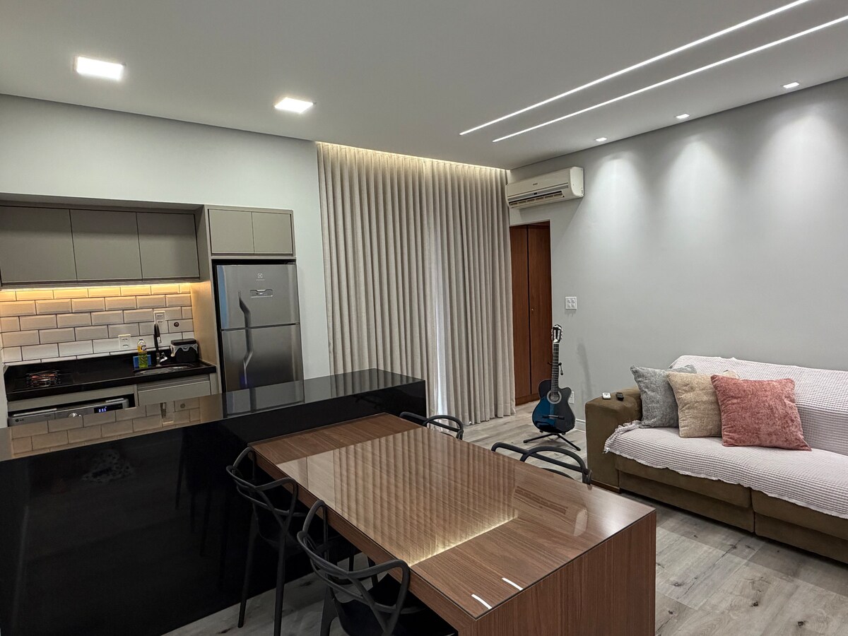 Nowy, dobrze wyposażony, dobrze wyposażony apartament, zadaszone miejsce parkingowe z windą! Położony w zamkniętej dzielnicy Praça da Savassi, łatwy dostęp do centrum miasta, w pobliżu Shopping Pátio Savassi i innych sklepów. Został niedawno umeblowany, aby przyjmować wymagających i gustownych klientów! 120Mg Wi-Fi Małe mieszkanie z salonem, połączoną kuchnią i apartamentem z szafą.