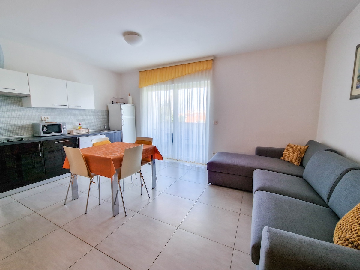 A renovated, super cozy apartment for 3-4 people. With an open spaced living room with a pull out sofa, fully equipped kitchen and dinner also comes a spacious bathroom with a bathtub, 1 bedroom with a double sized bed and a terrace with a beautiful view of the sea. Beach is 5 minutes walking away and the famous Zrce is 10 minutes drive from house! Tourist tax charged separately! Transfers and taxi service available!